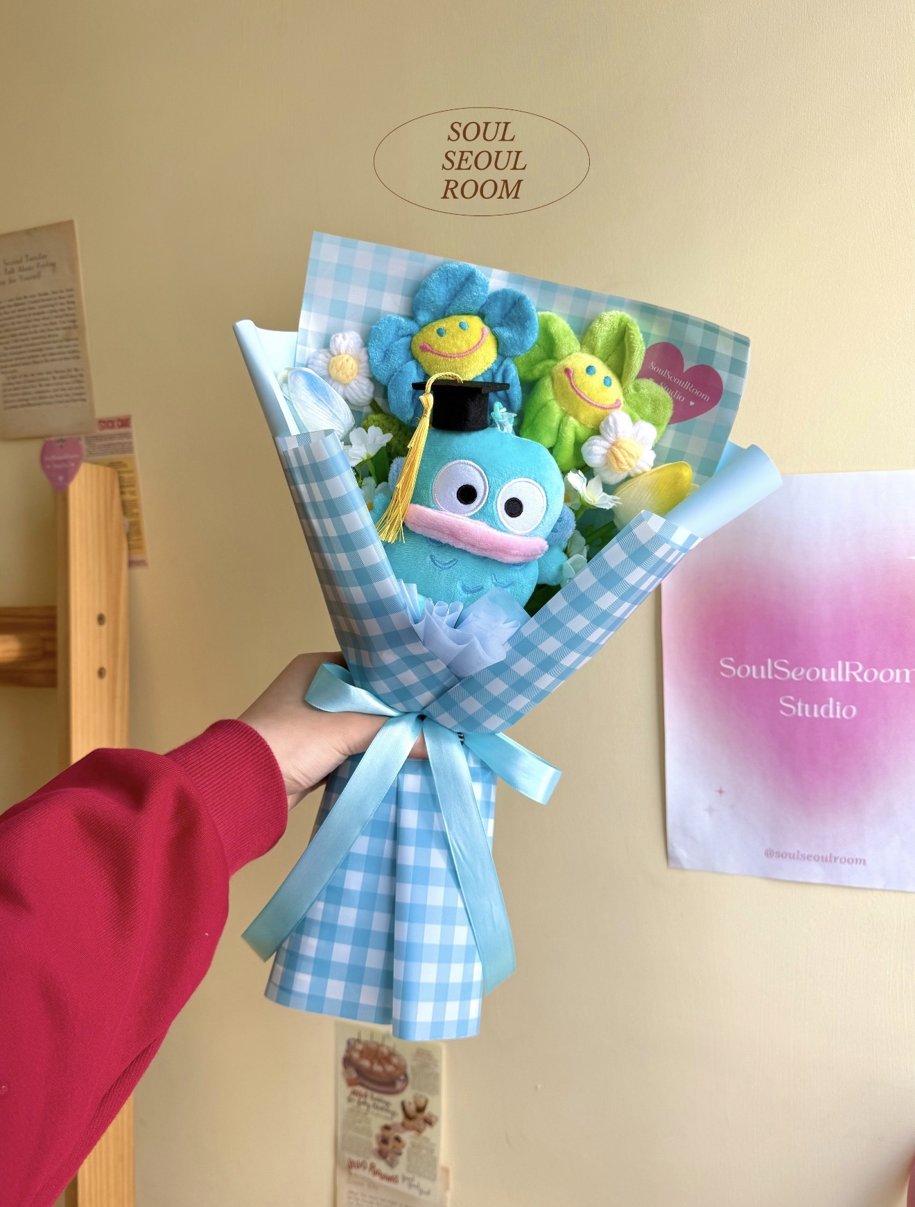 一束包括2枝笑臉小花 + 2支鬱金香仿真花 + 2支針織花 + 2支小雛菊仿真花 + 1隻韓國正版 水怪公仔